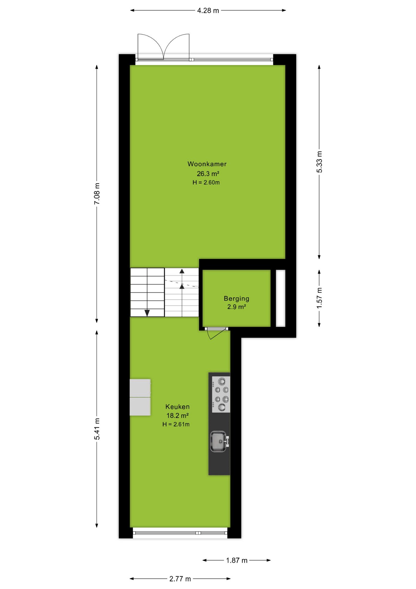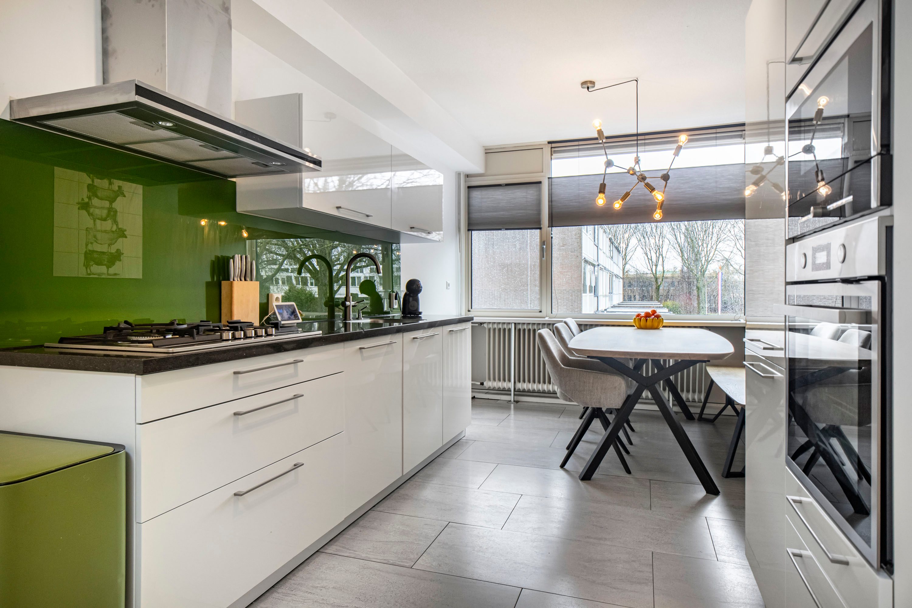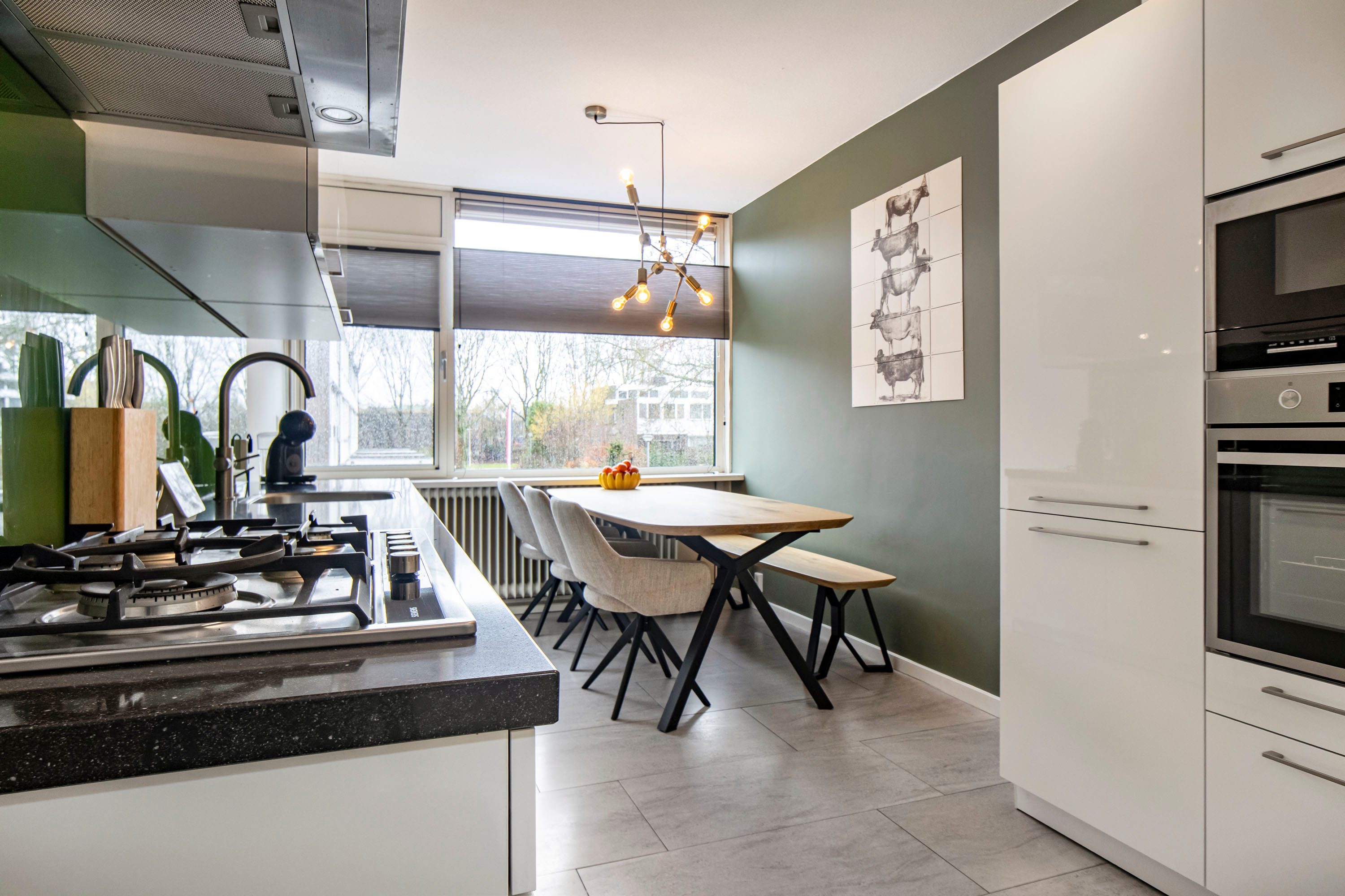 De keuken is uitgevoerd in een dubbele opstelling, waarbij aan één zijde een praktische apparatenwand is geplaatst. Deze moderne keuken is voorzien van diverse inbouwapparatuur en biedt daarnaast voldoende ruimte voor een gezellige eethoek. Vanuit de keuken heb je toegang tot een extra berging, ideaal voor voorraad of spullen die je graag uit het zicht bewaart.